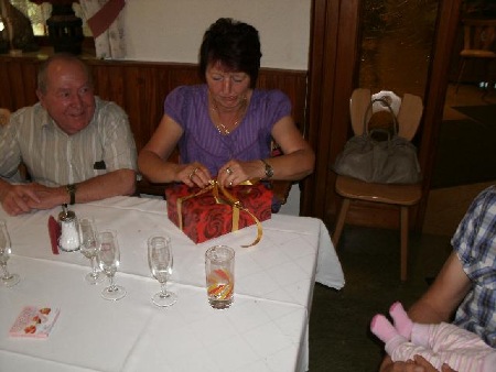 Kerstin hat dann ein schönes Gedicht vorgetragen und Renate packt jetzt das Geschenk
